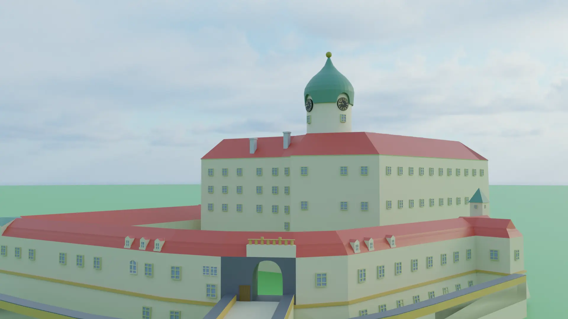 Tento obrázek ukazuje porovnání skutečné podoby zámku Poděbrady a jeho low-poly 3D modelu. Vlevo vidíte reálnou stavbu zámku, zatímco vpravo je jeho zjednodušená digitální verze. Model se zaměřuje na klíčové architektonické prvky, jako je symetrie budovy, rozmístění věží a hlavní fasády, což umožňuje snadnou vizualizaci a analýzu tohoto historického objektu.