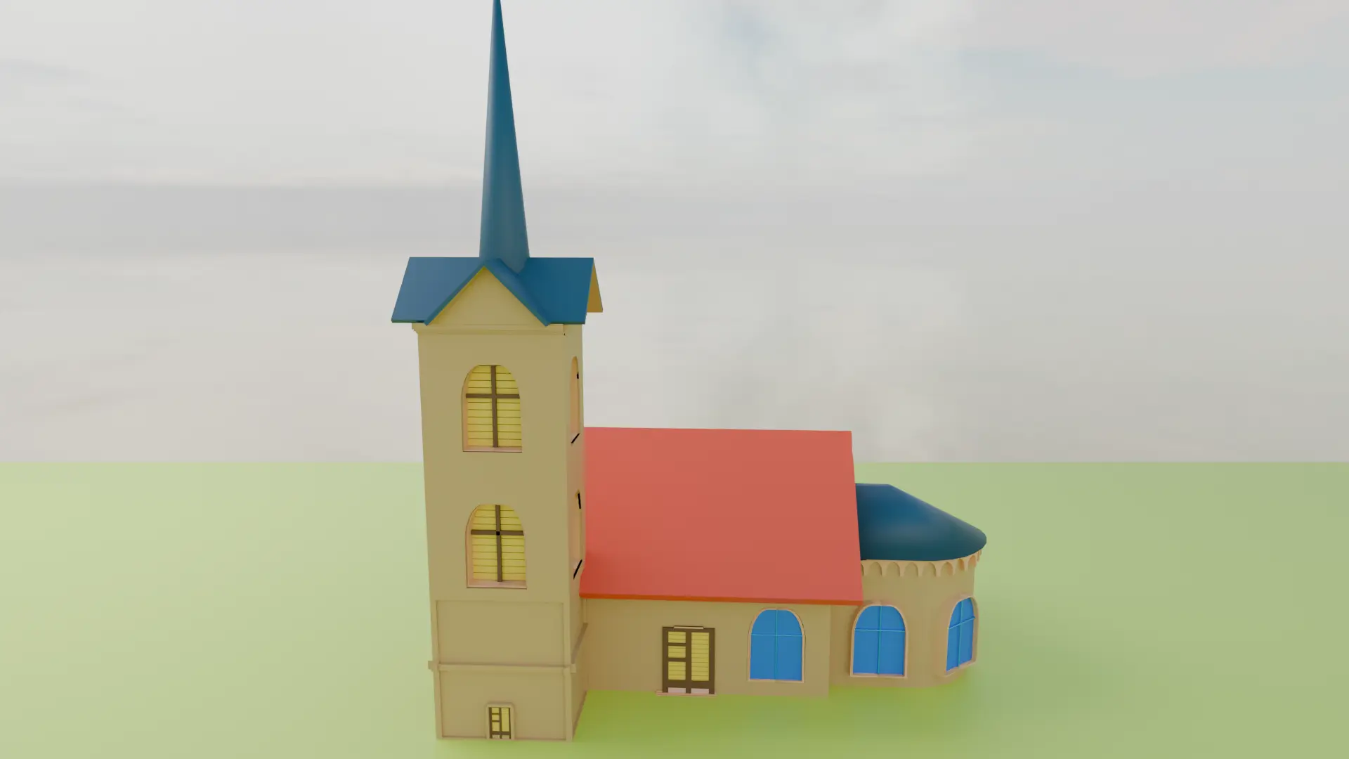 Na tomto obrázku můžete vidět porovnání skutečné podoby kostela v Městci Králové a jeho low-poly 3D modelu. Vlevo je zachycena reálná stavba, zatímco vpravo je její digitální rekonstrukce ve stylizované podobě. Tento zjednodušený model se soustředí na základní tvary a proporce budovy, což usnadňuje vizualizaci architektonických prvků a jejich analýzu.